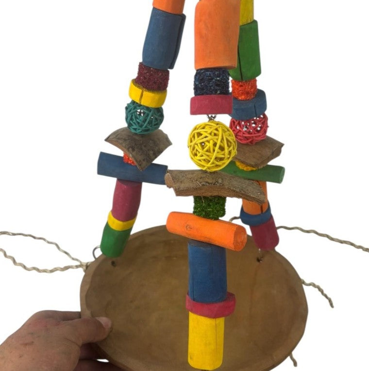 HANGING FEEDER - Look at this beautiful all natural feeder bowl! Chain suspension. Substantial weight of solid timber bowl at bottom aids stability and is tough. Ideal for feed or to contain a bowl of fun foraging elements such as vine balls, nuts in shell, natural browse ... the ideas are endless!